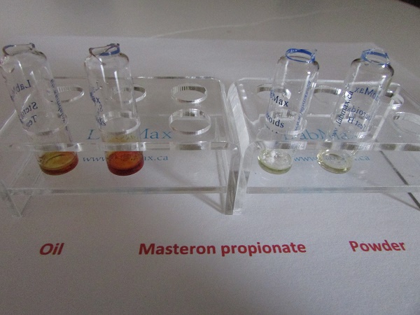 You should add a small amount of the sample—typically less than the volume of the test reagent. This usually amounts to one or a few drops of oil from the syringe. When adding oil, you will notice a slight initial color change, with the oil gradually becoming darker red. However, if you add raw powder, there is no immediate color change, and it may take longer for any reaction to occur. For oil-based samples, it takes a few minutes for the fluorescence to become more apparent in vial B under 365 nm UV light. The fluorescence will appear yellow to dark yellow, while the sample in vial A will look light brown to violet. In contrast, a sample containing raw powder will produce blue fluorescence in vial B and brighter blue fluorescence in vial A. If no fluorescence is observed, it indicates that there is no hormone present in the sample. If the fluorescence appears in different colors, it suggests that the sample may contain something else or has been contaminated with other steroids.The type of oil used as a carrier does not affect whether the sample will produce fluorescence if a hormone is present. However, the intensity of fluorescence may vary depending on the oil because different oils absorb and reflect light in different ways.