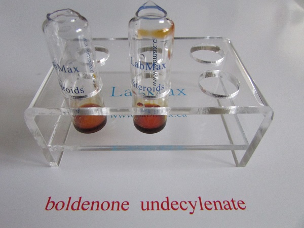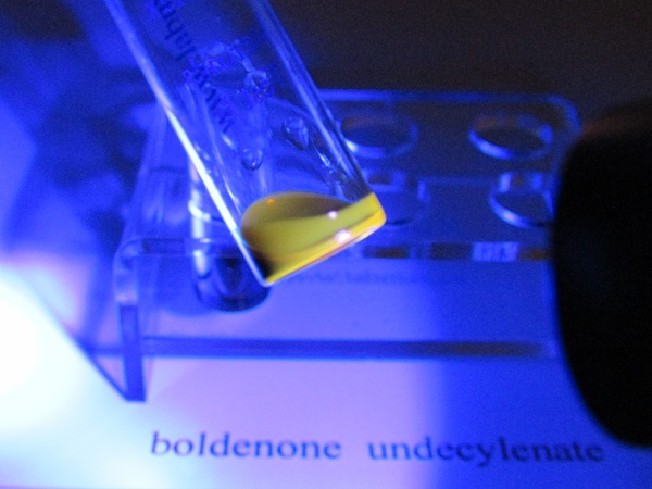 You need to drop only tiny amount of the test substance into the vials, no more than the amount of test reagent inside. One drop to a few small drops is enough. The initial color in vial A is orange changing to light brown and the color in vial B is dark orange changing to brown. Watching the color under normal light will not give you conclusive results. You need to watch vial B under UV light (you need 365 nm) only when you see the yellow fluorescence then you know that you have boldenone undecylenate.