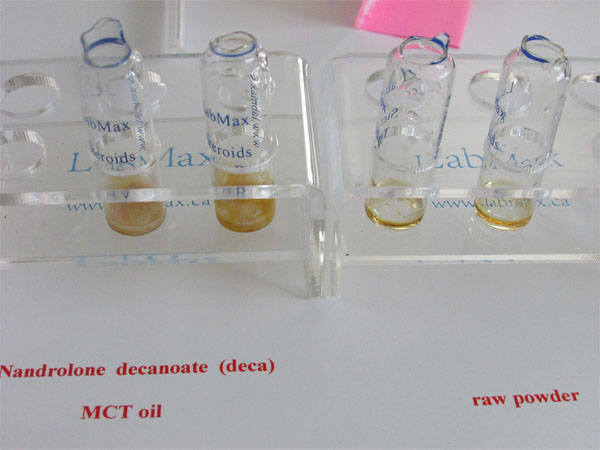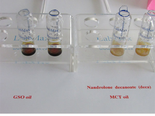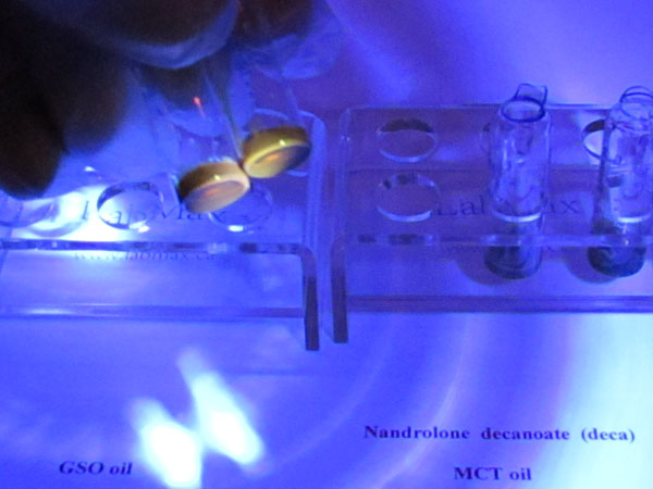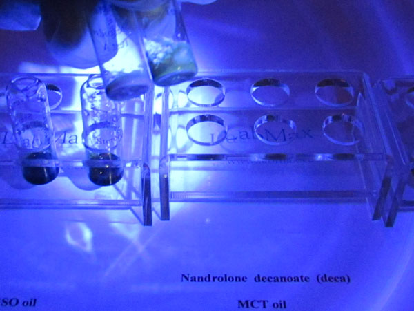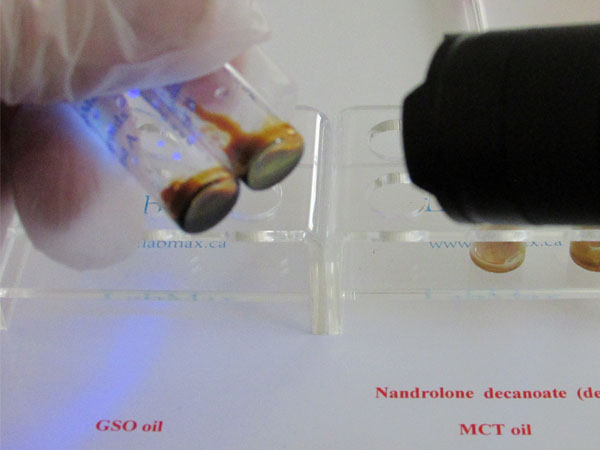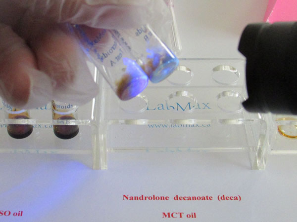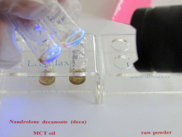 In this test, the initial color in vial A is red-brown, while vial B is orange-brown for GSO oil and lighter for MCT oil. For example, trenbolone will appear bright green. Each vial contains different test agents that react differently to various chemicals. Any discoloration in vial A or vial B may indicate contamination, so both test vials are necessary to confirm the presence of steroids and assess their quality. Some steroids will produce different initial colors in vial A, which can help distinguish between them. For instance, Nandrolone decanoate (oil-based) appears matte green under UV light when using GSO and Arachis oil, but shows a lighter green with MCT oil. The color coding for NPP is significantly different, which makes it easy to distinguish between Deca and NPP. The type of oil used as a carrier does not affect whether the sample will fluoresce if a hormone is present. However, the intensity of the fluorescence may vary depending on the oil, as different oils absorb and reflect light in different ways.