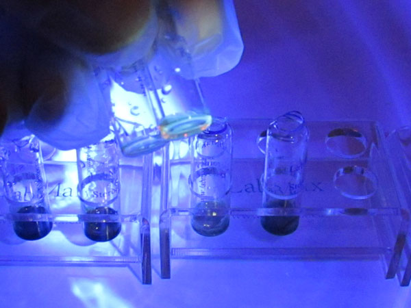 GSO oil under 365 UV light, left vial A, right vial B.
