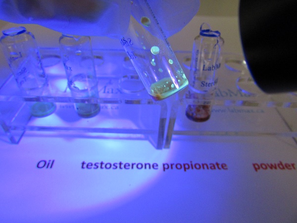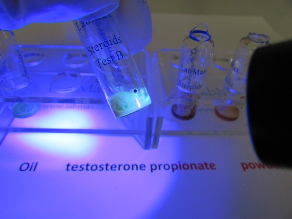 Each vial contains 0.1 ml of test reagent. This is the exact amount shown in the picture, and this is the amount you will receive. There may be droplets on the sides of the vial, so be sure to shake it to collect all of the reagent. Adding more reagent will not improve the test results. In fact, if the vial is overfilled, it will be impossible to conduct the test properly. In Vial A, you will observe an initial yellow-to-light green color, which changes to orange later. In Vial B, the initial color is yellow-to-orange. However, simply observing the sample under normal daylight will not provide a positive identification. You must examine the sample under UV light (365 nm) to confirm the presence of the hormone. Under UV light, Vial B will emit a blue-greenish fluorescence, which is a positive indicator of testosterone propionate. If there is no fluorescence, the sample does not contain any hormone. Neither oil nor alcohol will fluoresce under UV light. These tests were conducted under ideal conditions, assuming the sample is pharmaceutical grade and contains only BA, BB, oil, and testosterone. All samples were also tested using GC/MS to ensure that no other substances were present. If your sample is contaminated, you may not get the same test results. We often receive emails from people claiming that their testosterone propionate samples do not show the expected fluorescence. The answer is simple: either the sample contains something else, or your testosterone propionate is mixed with another steroid. If you add a small amount of raw powder to the vials, the initial color change will be minimal. In this test, we added slightly too much powder to Vials A and B, which resulted in a more rapid color change to red. The type of oil used as a carrier does not affect whether the sample will produce fluorescence if a hormone is present. However, the intensity of the fluorescence may vary depending on the oil, as different oils absorb and reflect light in different ways.