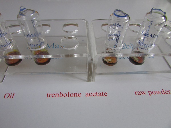 Trenbolone acetate, oil left, powder right, initial colors just after dropping the samples.