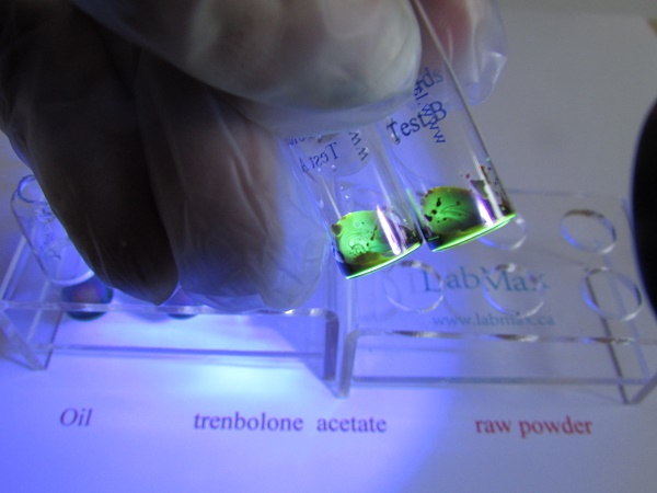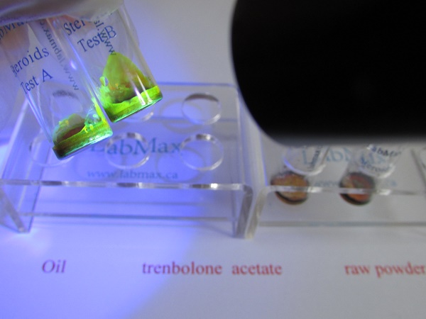 Trenbolone acetate oil under 365UV light, vials A and B.